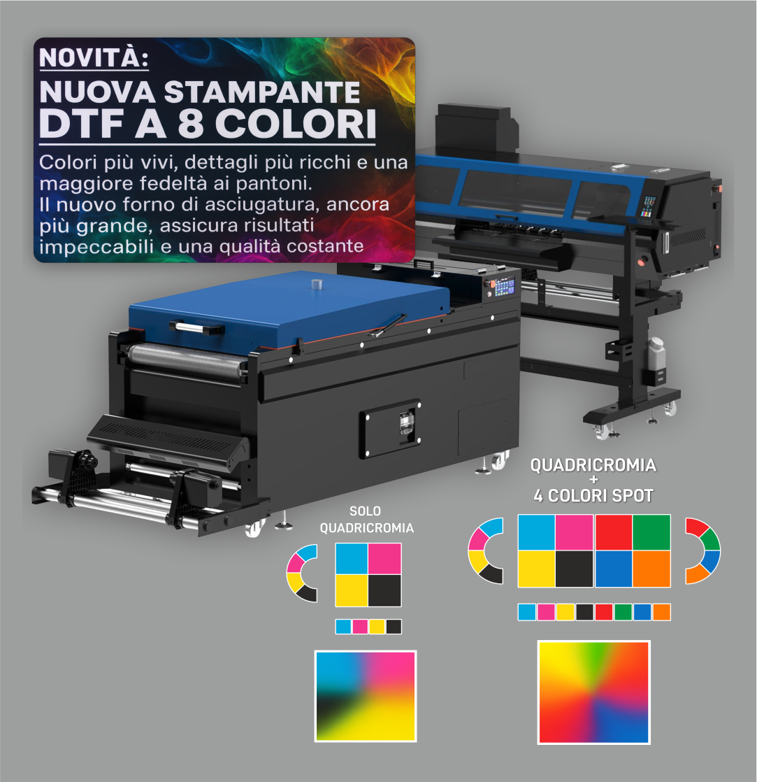 Il nostro servizio di Stampa e Taglio DTF offre transfer di qualità superiore, realizzati con tecnologia avanzata e pensati per garantire risultati impeccabili su qualsiasi tipo di tessuto. Grazie alla nuova stampante a 8 colori (CMYK + verde, rosso, arancio e blu), otteniamo una gamma cromatica estesa che permette di riprodurre fedelmente anche le grafiche più complesse, con colori più brillanti, sfumature più ricche e una resa visiva di livello professionale. Colori coprenti, bianco coprente, ottima resistenza ai lavaggi. Possibilità di taglio dei loghi tramite plotter dedicati, per sagomature precise e finiture di alta qualità.